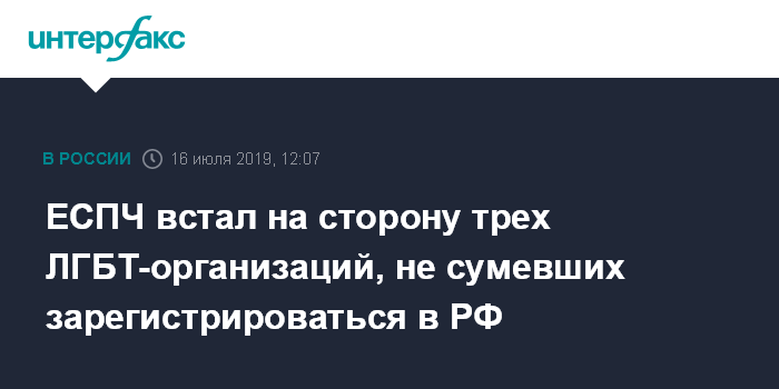 Москва. 16 июля. INTERFAX.RU - Европейский суд по правам человека признал незаконными решение российских властей, отказавших в регистрации трем ЛГБТ-организациям; об этом говорится в судебном коммюнике, распространенном во вторник.