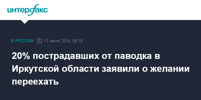 Москва. 17 июля. INTERFAX.RU - Пятая часть жителей Иркутской области, попавших в зону затопления, выразили желание переехать в другие населенные пункты, сообщает пресс-служба правительства региона в среду по итогам встречи с вице-премьером правительства РФ Виталием Мутко.