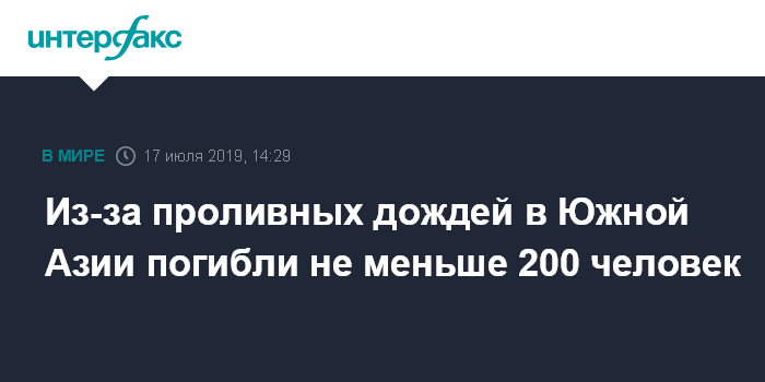 Москва. 17 июля. INTERFAX.RU - В Индии, Непале, Бангладеш и Пакистане в результате муссонных дождей погибли по меньшей мере 200 человек, сотни тысяч были вынуждены покинуть дома, сообщает в среду телеканал France 24.