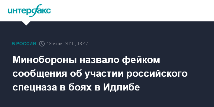 Москва. 18 июля. INTERFAX.RU - В Минобороны России отрицают участие в боевых действиях в сирийском Идлибе российских "сухопутных войск" и "специальных подразделений". В пресс-релизе ведомства эта информация названа "очередным фейком".