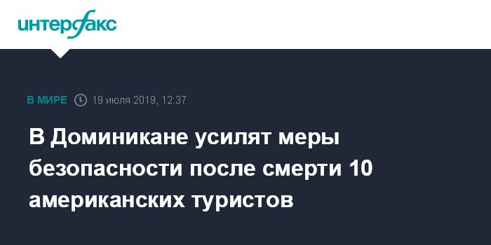Москва. 19 июля. INTERFAX.RU - Власти Доминиканы усилят меры безопасности для туристов после того, как в стране за год умерло десять путешественников из США, сообщает в пятницу CNN.