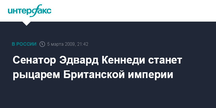 Лондон. 5 марта. INTERFAX.RU - Премьер-министр Великобритании Гордон Браун в выступлении в конгрессе США объявил, что один старейших американских сенаторов Эдвард Кеннеди станет почетным рыцарем Британской империи за заслуги в укреплении отношений между США и Великобританией и усилия по урегулированию ситуации в Северной Ирландии, пишет в четверг британская Times.