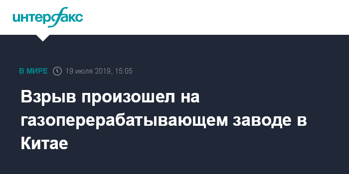Москва. 19 июля. INTERFAX.RU - Взрыв произошел на газоперерабатывающем заводе в центральной части Китая, сообщает в пятницу агентство Associated Press.