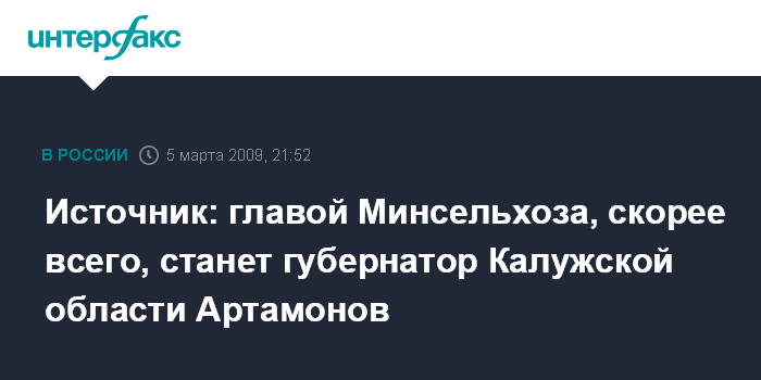 Москва. 5 марта. INTERFAX.RU - Министерство сельского хозяйства РФ, скорее всего, возглавит губернатор Калужской области Анатолий Артамонов, сообщил "Интерфаксу" осведомленный источник во властных структурах.