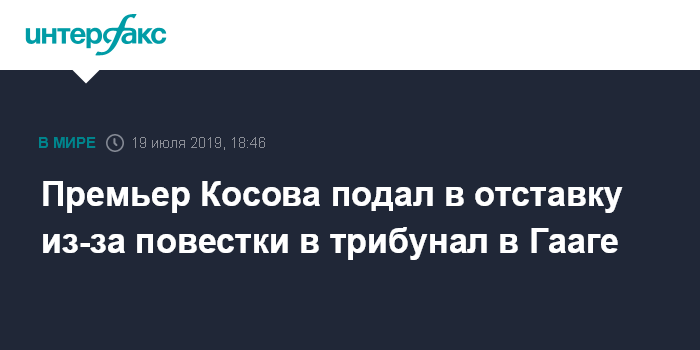 Москва. 19 июля. INTERFAX.RU - Премьер-министр Косова Рамуш Харадинай в пятницу объявил об отставке после того, как получил повестку в качестве подозреваемого в специальный трибунал по Косово в Гааге, передает телерадиокомпания "Радио и телевидение Сербии".