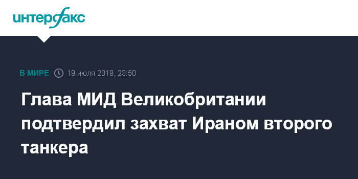 Москва. 19 июля. INTERFAX.RU - Министр иностранных дел Великобритании Джереми Хант подтвердил, что иранские силы безопасности задержали в пятницу два танкера, шедшие под британским и либерийским флагами, передает "Би-би-си".