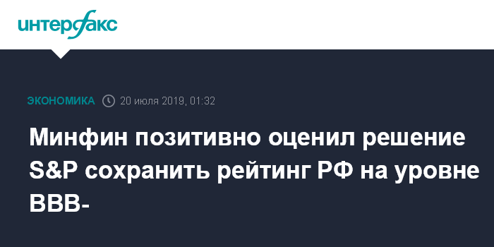 Москва. 20 июля. INTERFAX.RU - Международное рейтинговое агентство Standard & Poor's подтвердило суверенный рейтинг РФ на уровне BBB- со стабильным прогнозом, российское министерство финансов позитивно оценило решение агентства.