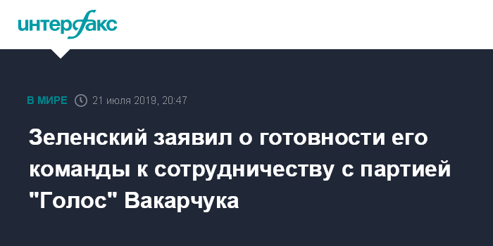 Москва. 21 июля. INTERFAX.RU - Президент Украины Владимир Зеленский дал понять, что партия "Слуга народа" готова обсуждать возможное сотрудничество с партией "Голос" Святослава Вакарчука.