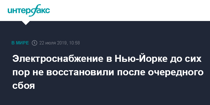 Москва. 22 июля. INTERFAX.RU - Экстренные службы восстанавливают подачу электроэнергии в Нью-Йорке после воскресного сбоя, однако без света до сих остается около 40 тысяч человек, сообщает в понедельник агентство Associated Press.