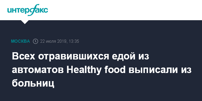 Москва. 22 июля. INTERFAX.RU - На утром 22 июля в московских больницах не осталось людей, отравившихся едой из вендинговых автоматов Healthy food. Об этом "Интерфаксу" рассказал информированный источник.
