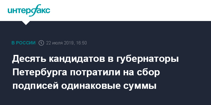 Москва. 22 июля. INTERFAX.RU - Десять из 28 кандидатов в губернаторы Петербурга потратили на сбор подписей одинаковую сумму - около 250 тысяч рублей.