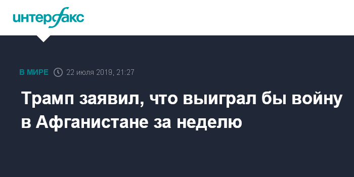 Москва. 22 июля. INTERFAX.RU - Президент США Дональд Трамп заявил, что Соединенные Штаты могли бы победить в войне с Афганистаном в самые сжатые сроки.