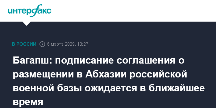 Москва. 6 марта. INTERFAX.RU - Президент Абхазии Сергей Багапш заявляет, что в ближайшее время будет подписано российско-абхазское соглашение о размещении на территории республики военной базы РФ сроком на 49 лет. "Работа над соглашением завершается, документ уже на выходе и будет подписан в ближайшее время", - сказал Багапш "Интерфаксу" в пятницу.