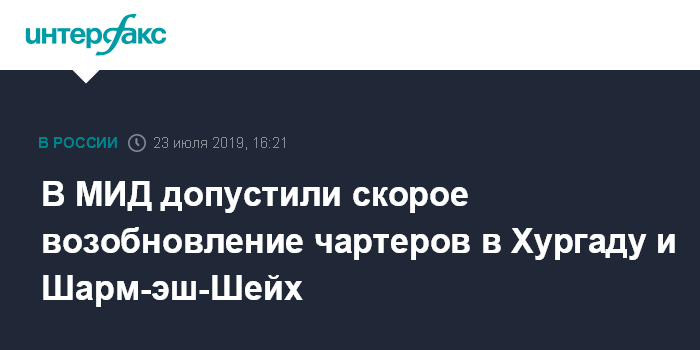 Москва. 23 июля. INTERFAX.RU - В МИД России надеются, что "в самое ближайшее время" будут достигнуты "окончательные договореннотси" по возобновлению чартерных авиаперелетов в аэропорты египетских курортов Хургады и Шарм-эш-Шейха. Об этом заявил в Госдуме замминистра иностранных дел Михаил Богданов.