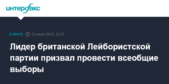 Москва. 23 июля. INTERFAX.RU - Лидер оппозиционной Лейбористской партии Великобритании Джереми Корбин выступил с призывом выйти на демонстрацию с требованием проведения в стране всеобщих выборов.