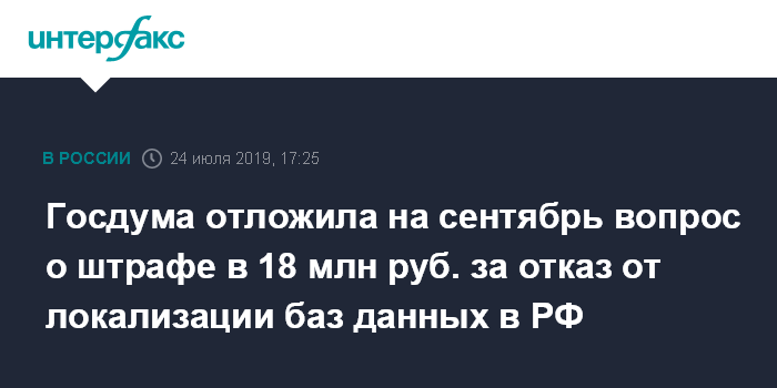 Госдума отложила на сентябрь вопрос о штрафе в 18 млн руб. за отказ от локализации баз данных в РФ