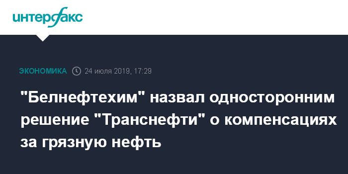 Москва. 24 июля. INTERFAX.RU - Решение совета директоров "Транснефти" о том, что компенсации пострадавшим от инцидента на нефтепроводе "Дружба" не превысят $15 за баррель загрязненной нефти, было принято в одностороннем порядке, это юридически неправильно, заявил "БелТА" зампредседателя "Белнефтехима" Владимир Сизов.