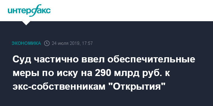 Москва. 24 июля. INTERFAX.RU - Суд частично удовлетворил ходатайство ЦБ РФ в лице банка "Открытие" об обеспечительных мерах по иску на 289,5 млрд рублей к бывшим собственникам и менеджменту банка "ФК Открытие", передал корреспондент "Интерфакса" из зала суда.