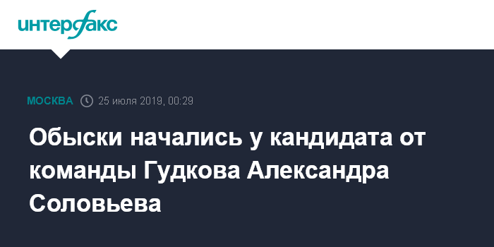 Москва. 25 июля. INTERFAX.RU - Пресс-секретарь Дмитрия Гудкова Алексей Обухов сообщил "Интерфаксу", что у члена Партии перемен и кандидата в Мосгордуму по 3 округу от команды Гудкова Александра Соловьева также проходят обыски.