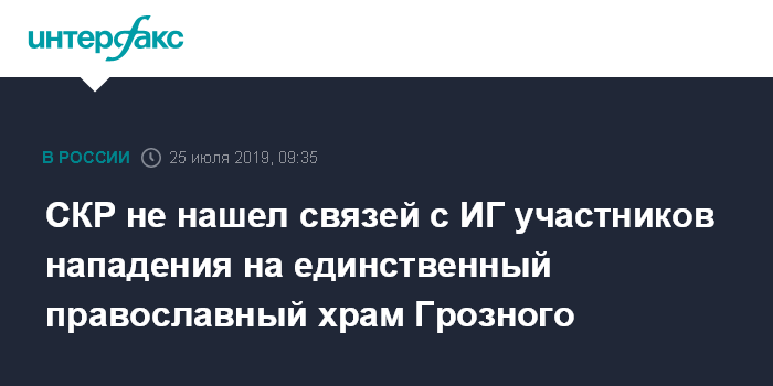 Москва. 25 июля. INTERFAX.RU - Участниками нападения на храм Михаила Архангела в Грозном в мае 2018 года оказались радикализировавшиеся студенты Чеченского базового медицинского колледжа, их связей с боевиками в Сирии или других странах не обнаружено. Расследование дела завершилось, узнал "Коммерсантъ".