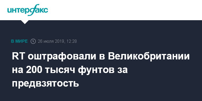 Москва. 26 июля. INTERFAX.RU - Британский регулятор СМИ Ofcom сообщил, что оштрафовал российский телеканал RT на 200 тыс. фунтов стерлингов за нарушение правил вещания. Ведомство также обязало канал обнародовать краткое содержание этого решения.