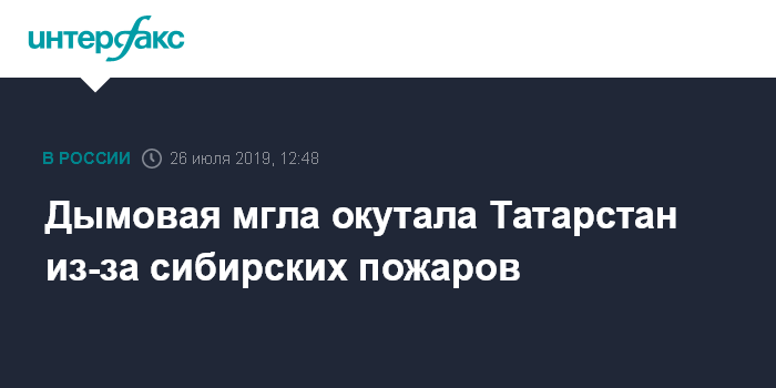 Москва. 26 июля. INTERFAX.RU - Дым от сибирских лесных пожаров дошел до Татарстана; с 25 июля над регионом повисла дымовая мгла, сообщили в пятницу в местном управлении по гидрометеорологии и мониторингу окружающей среды.