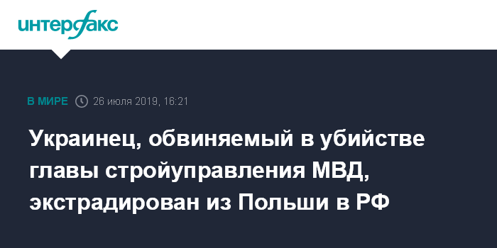 Москва. 26 июля. INTERFAX.RU - Гражданин Украины, обвиняемый в убийстве гендиректора ремонтно-строительного управления МВД РФ, экстрадирован в Россию из Польши, сообщила "Интерфаксу" в пятницу официальный представитель МВД России Ирина Волк.