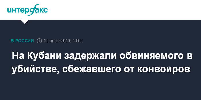 Москва. 28 июля. INTERFAX.RU - В Краснодарском крае мужчина, обвиняемый в убийстве, сбежал при конвоировании. Злоумышленник был задержан в Армавире, сообщил "Интерфаксу" информированный источник.