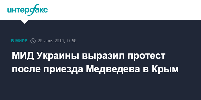 Москва. 28 июля. INTERFAX.RU - Министерство иностранных дел Украины выразило протест, после того как в Крым прибыла делегация во главе с председателем российского правительства Дмитрием Медведевым.