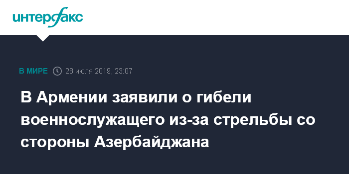 Москва. 28 июля. INTERFAX.RU - На северо-восточном участке границы Армении от пули, выпущенной с азербайджанской стороны, погиб военнослужащий контрактной службы, заявил пресс-секретарь Министерства обороны Армении Арцрун Ованнисян в фейсбуке.