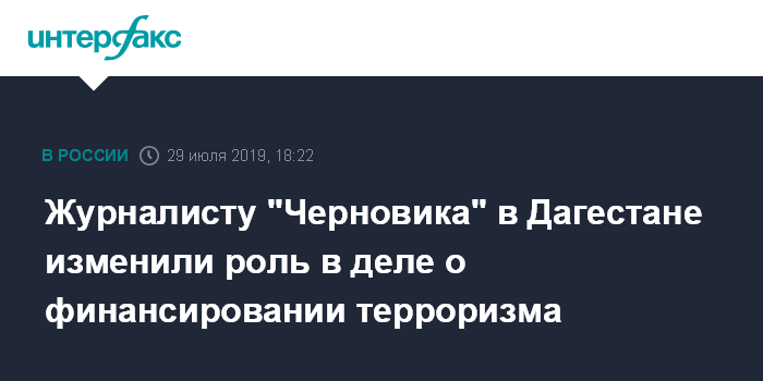 Москва. 29 июля. INTERFAX.RU - Журналисту дагестанского издания "Черновик" Абдулмумину Гаджиеву изменили квалификацию обвинения, говорится в сообщении пресс-службы правозащитного центра "Мемориал".