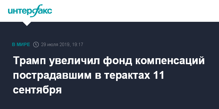 Москва. 29 июля. INTERFAX.RU - Президент США Дональд Трамп в понедельник подписал в Вашингтоне закон, который увеличивает Фонд компенсаций пострадавшим и родственникам погибших при трагедии 11 сентября 2001 года.