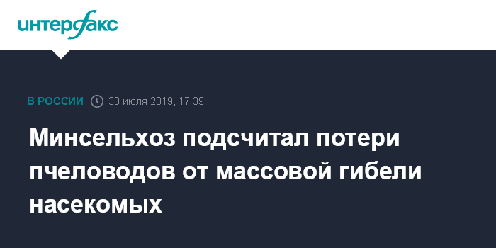 Москва. 30 июля. INTERFAX.RU - В 25 регионах России, согласно данным на 29 июля, погибло 39,6 тыс. пчелосемей сообщает Минсельхоз. Это составляет 1,3% от их общего количества (3,09 млн пчелосемей).