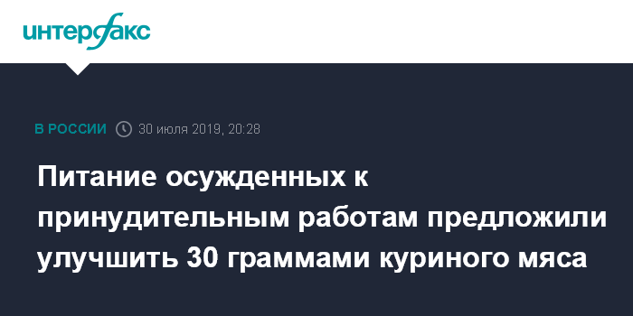 В сообщении говорится, что министерство предложило заменить муку соевую текстурированную в количестве 10 грамм на 30 грамм мяса птицы в сутки. По мнению Минюста, это позволит ввести дополнительные белки животного происхождения в рацион питания осужденных к принудительным работам.
