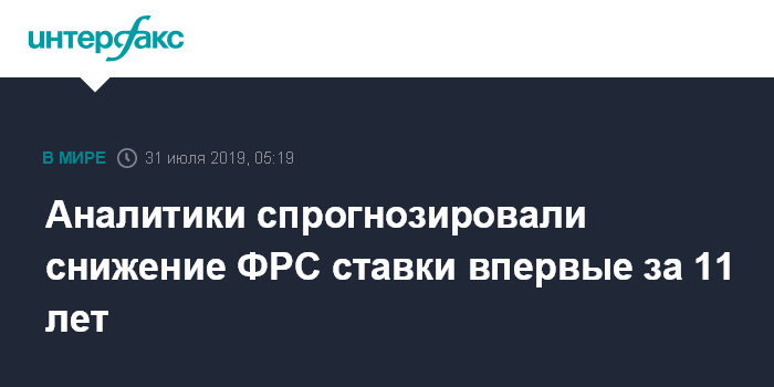 Москва. 31 июля. INTERFAX.RU - Федеральная резервная система (ФРС) снизит базовую процентную ставку впервые с 2008 года по итогам июльского заседания, прогнозирует большинство аналитиков и участников рынка.