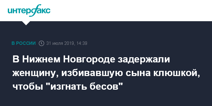 Москва. 31 июля. INTERFAX.RU - В Нижнем Новгороде возбудили уголовное дело против 29-летней женщины, подозреваемой в том, что она регулярно связывала своего 12-летнего сына и избивала хоккейной клюшкой, чтобы "изгнать бесов".