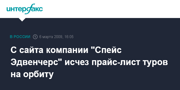Москва. 6 марта. INTERFAX.RU - Компания "Спейс Эдвенчерс", предоставляющая миллионерам услуги полетов в космос на российских кораблях "Союз", убрала со своего сайта прайс-лист части предоставляемых услуг. Из раздела "Орбитальные космические полеты" исчезли цены на тур к Международной космической станции (МКС) и на выход в открытый космос.
