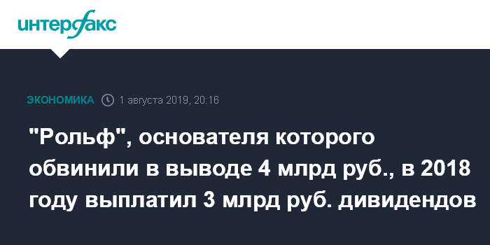 Москва. 1 августа. INTERFAX.RU - ООО "Рольф" (входит в группу "Рольф") в 2018 году выплатило акционерам 2,99 млрд рублей дивидендов, следует из данных аналитической системы "СПАРК-Интерфакс".