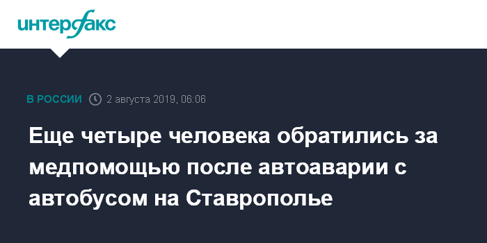 Москва. 2 августа. INTERFAX.RU - За медицинской помощью обратились еще четыре человека, которые пострадали в пятницу в автоаварии с автобусом и грузовиком в Апанасенковском районе на Ставрополье, сообщили "Интерфаксу" в районной больнице.