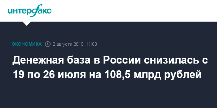 На 19 июля денежная база в России равнялась 10547,5 млрд рублей. Таким образом, за период она снизилась на 1,03%, или на 108,5 млрд рублей.