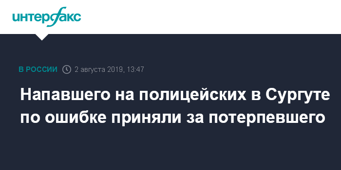 Москва. 2 августа. INTERFAX.RU - Полицейские, на которых было совершено нападение 1 августа в Сургуте, приняли за пострадавшего мужчину, который на них затем напал. Об этом рассказал источник "Интерфакса" в правоохранительных органах.