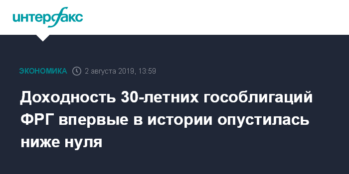 Москва. 2 августа. INTERFAX.RU - Доходность 30-летних гособлигаций Германии в пятницу впервые опустилась ниже нулевого уровня на опасениях эскалации торгового конфликта между США и Китаем.