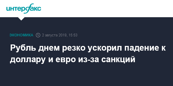 Как отмечают эксперты "Интерфакс-ЦЭА", рубль заметно усилил снижение к доллару и евро на дневных торгах. Падение котировок нацвалюты происходит на фоне сильного снижения мировых площадок после того, как стало известно об угрозах введения новых пошлин на ввоз в США товаров из Китая, а также новостей относительно новых антироссийских санкций. Дополнительный негативный импульс к падению рубля дал сильнейшим за четыре года падением нефти, наблюдавшимся на предыдущих торгах.