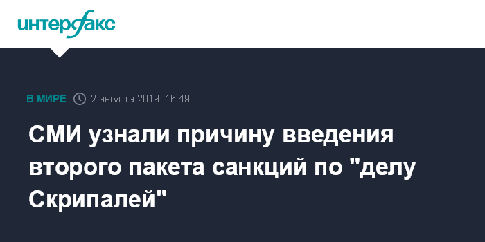 Москва. 2 августа. INTERFAX.RU - США вводят в отношении России второй пакет санкций в связи с "делом Скрипалей", так как Москва не выполнила требование Вашингтона и не предоставила гарантии неприменения химического и биологического оружия, объяснил агентству Bloomberg высокопоставленный чиновник администрации США.