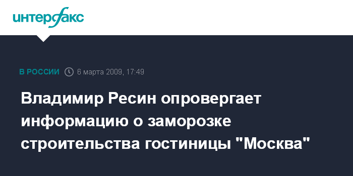 Москва. 6 марта. INTERFAX.RU - Глава столичного строительного комплекса Владимир Ресин опроверг информацию, прошедшую в пятницу в ряде СМИ, о заморозке строительства отеля на месте бывшей гостиницы "Москва".