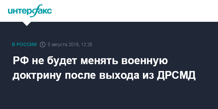 Москва. 5 августа. INTERFAX.RU - В Москве не видят оснований для пересмотра военной доктрины России после прекращения действия Договора о ликвидации ракет средней и меньшей дальности, заявил замглавы МИД РФ Сергей Рябков.