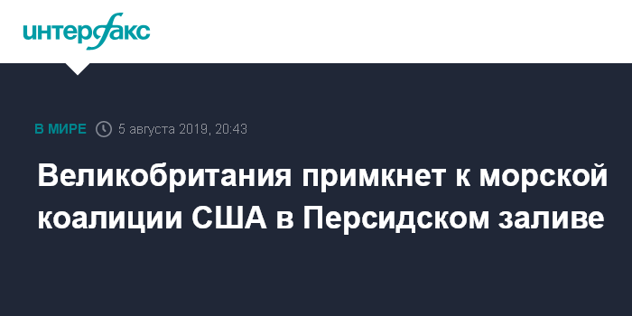 Москва. 5 августа. INTERFAX.RU - Великобритания решила присоединиться к морской коалиции под эгидой США для защиты безопасного судоходства в Персидском заливе. Об этом заявил глава оборонного ведомства Великобритании Бен Уоллес.