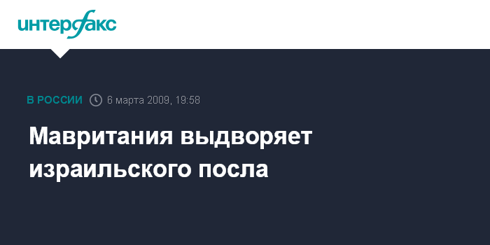 Иерусалим. 6 марта. INTERFAX.RU - Мавритания выдворила в пятницу посла Израиля, сообщают израильская армейская радиостанция "Галей цахал" и сайт газеты Jerusalem Post.