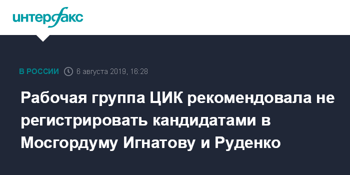 Москва. 6 августа. INTERFAX.RU - Рабочая группа Центризбиркома рекомендовала не регистрировать кандидатами в Мосгордуму самовыдвиженцев Екатерину Игнатову и Александра Руденко. Окончательное решение о них ЦИК примет в среду.