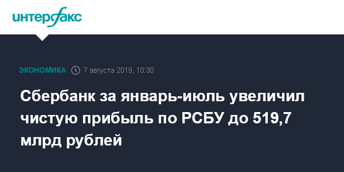 Москва. 7 августа. INTERFAX.RU - Сбербанк России за январь-июль 2019 года увеличил чистую прибыль по РСБУ по сравнению с аналогичным периодом прошлого года на 10,8% - до 519,7 млрд рублей. Об этом говорится в пресс-релизе кредитной организации.